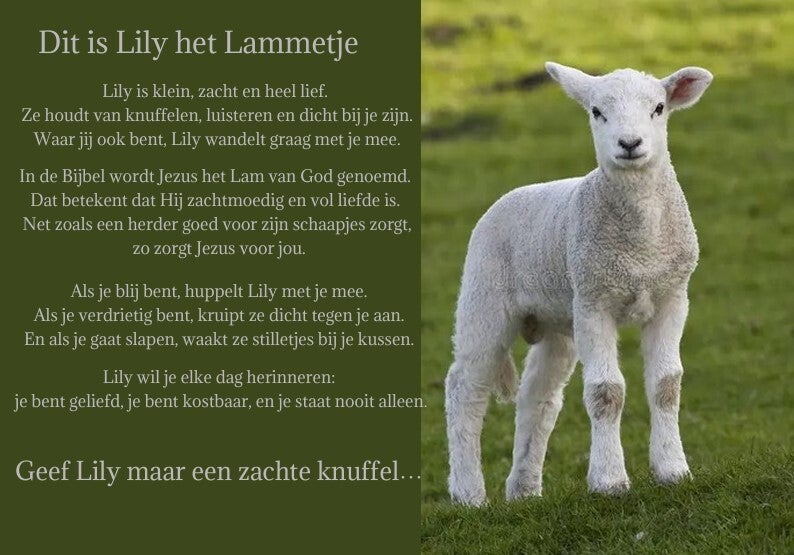 Dit lieve lammetje is 100% handgemaakt door Studio W&E. Ze is heerlijk zacht. Zittend heeft ze een lengte van 15 centimeter. Als je Lilly bestelt krijg je er ook een mooi verhaaltje bij! Wassen op maximaal 40 graden, niet in de droger.