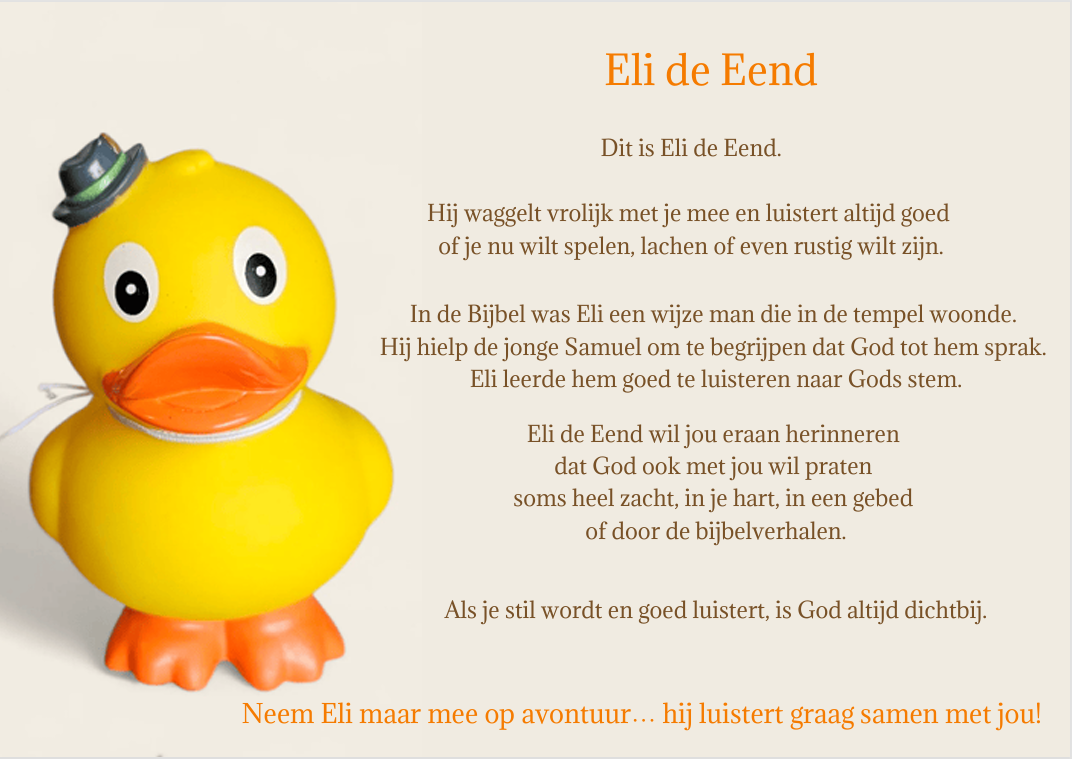 Dit lieve eendje is 100% handgemaakt door Studio W&E. Hij is heerlijk zacht. Hij komt in twee soorten kleuren; geel of creme/wit. Hij heeft een lengte van ongeveer 15 centimeter. Als je Eli bestelt krijg je er ook een mooi verhaaltje bij! Wassen op maximaal 40 graden, niet in de droger.